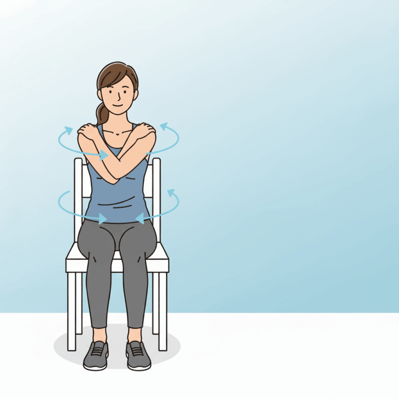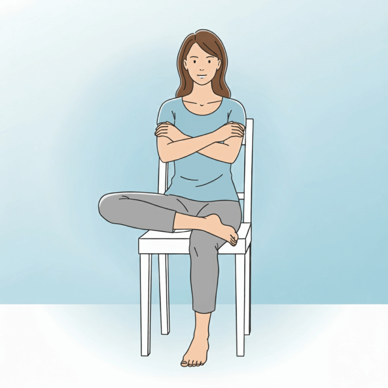 1. 椅子に浅く座り、両腕を胸の前でクロスします。