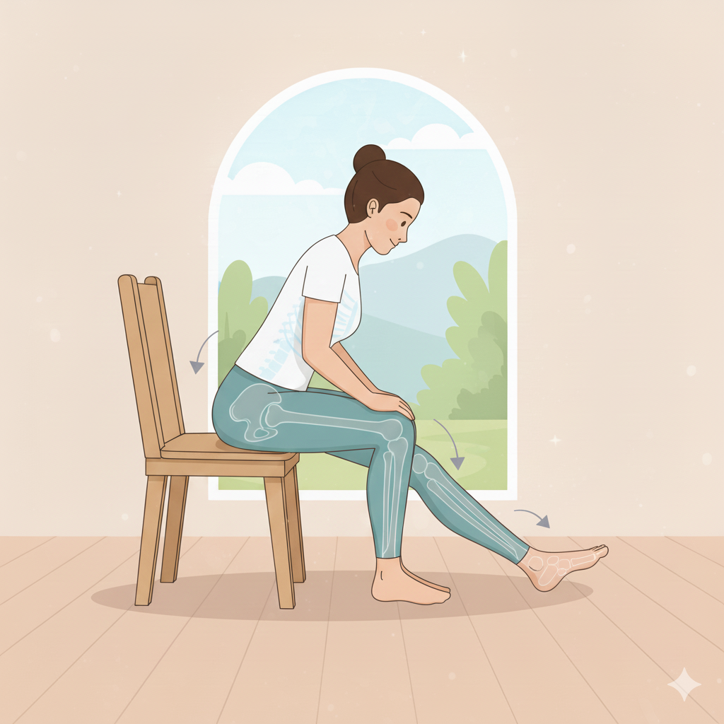 1. 椅子に浅く座り、片脚を前に伸ばします。