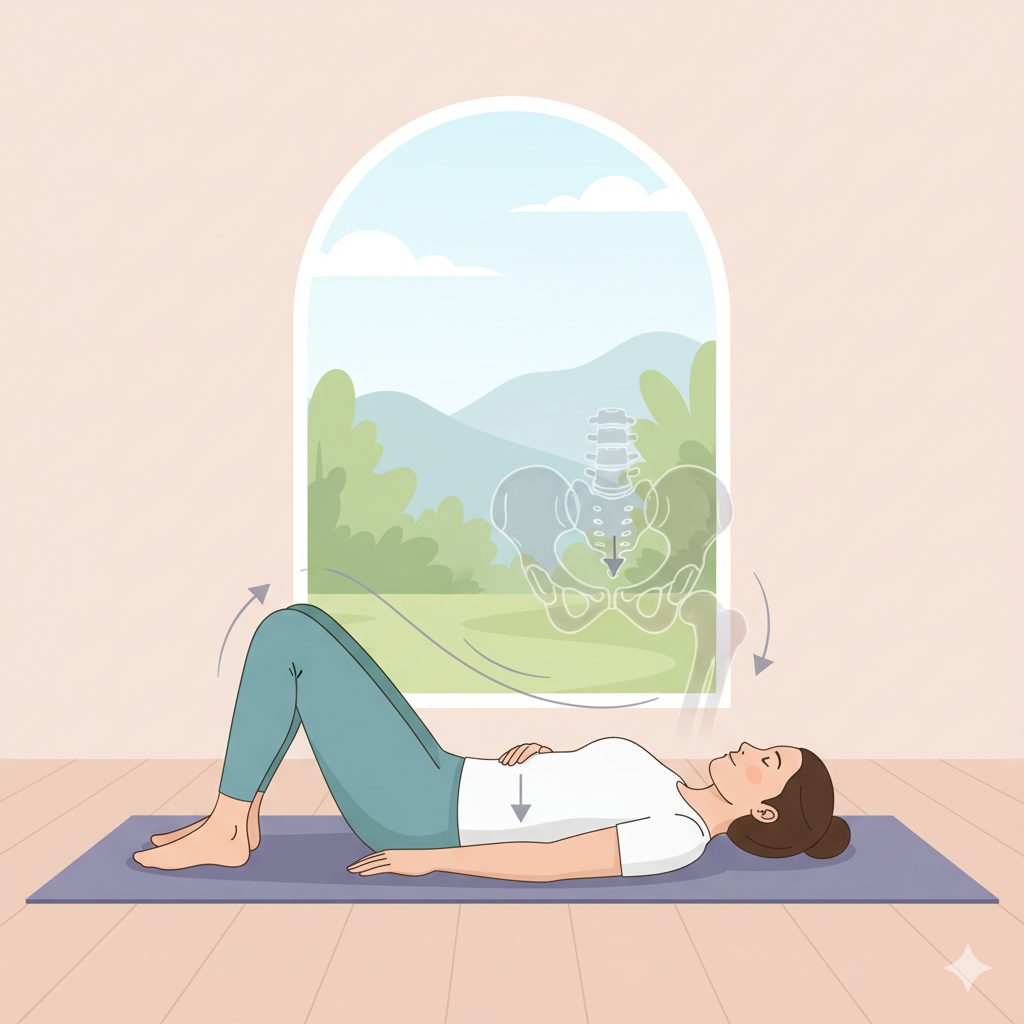 2. 骨盤を前後にゆっくり動かし、腰を床に押しつける→少し浮かせるを繰り返します。